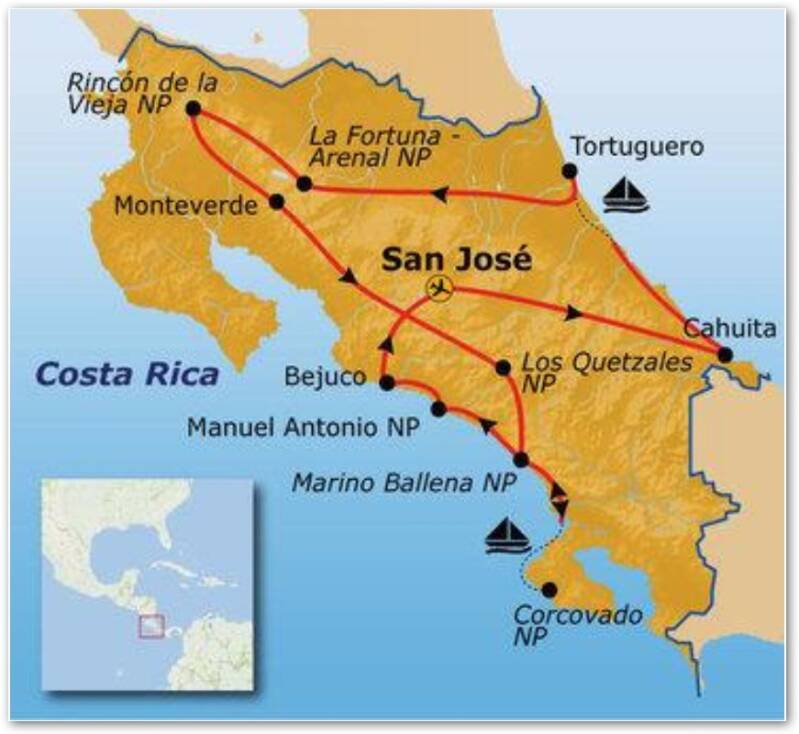 Route van de rondreis in Costa Rica. Nadere info volgt nog.